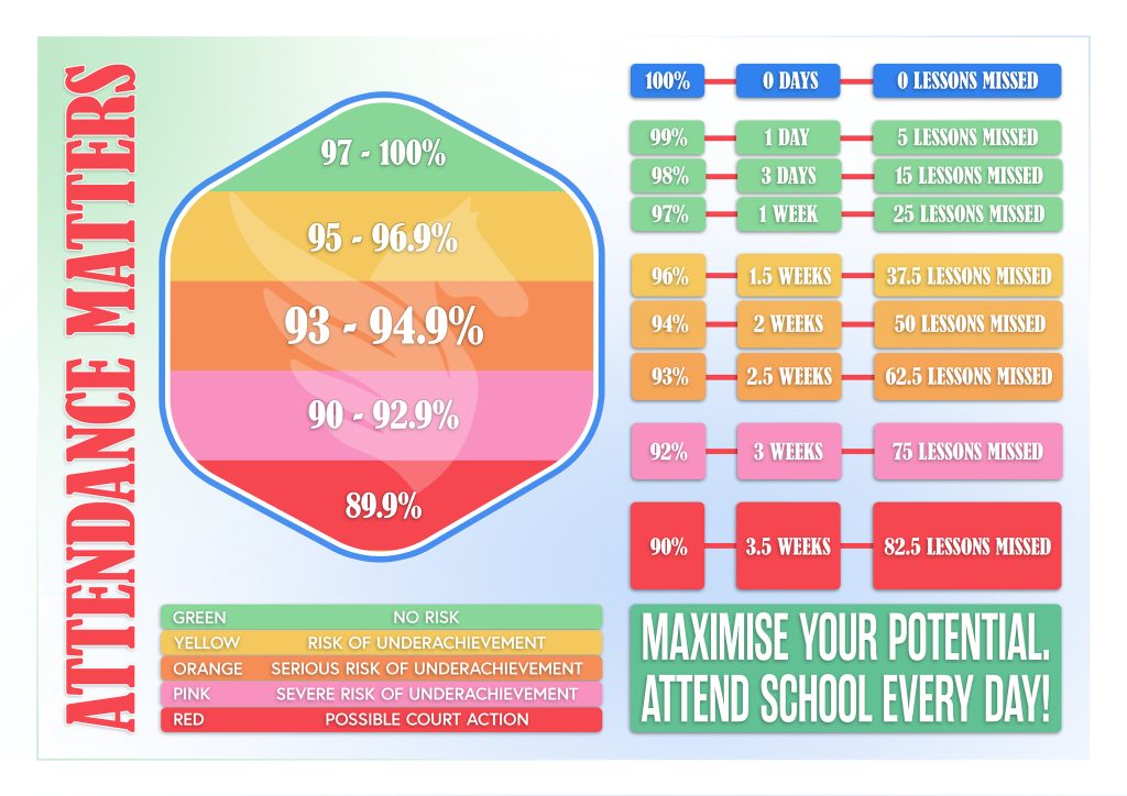There is a well-established link between good attendance and high achievement in public examinations. In line with local authority guidance, any student whose attendance falls below 90% is classed as a persistent absentee. This is equivalent to 19 days of absence over the school year. Minor ailments, such as headaches or mild colds, are not considered valid reasons for missing school.